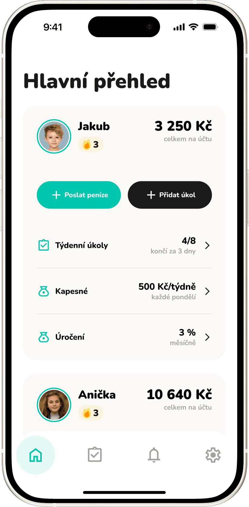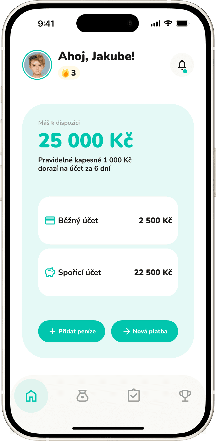Správa kapesného nemůže být jednodušší. Jak rodič, tak dítě vidí jak výši, tak i další připsání pravidelného kapesného.